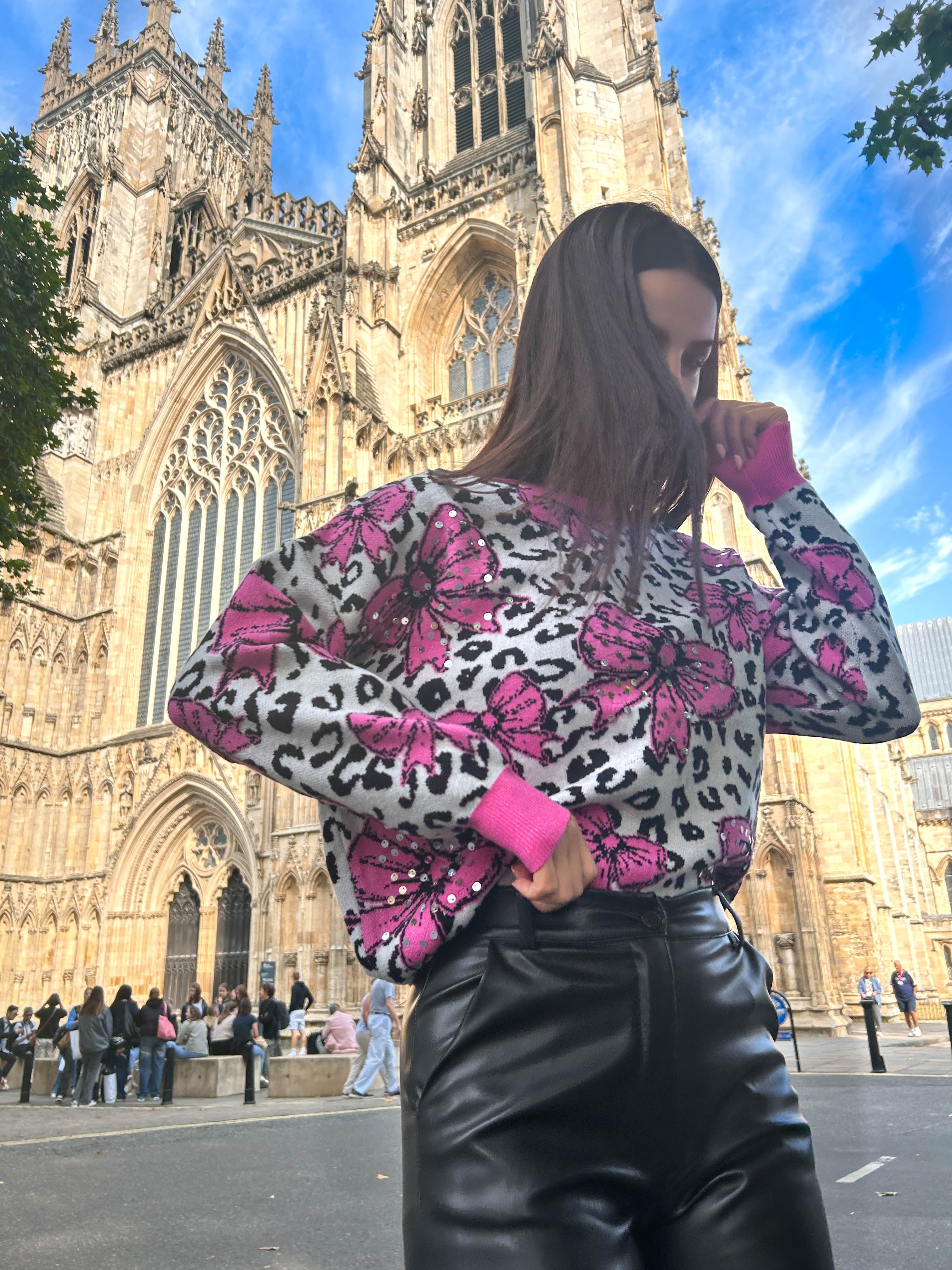 Bow Me Your Wild Side - Pink Leopard Bow Print Sequin Knitted Jumper