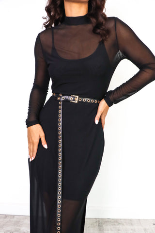 Let the alarm bells ring when people you in this belt, Doll, its dangerous to look this good! Featuring a black faux leather base with gold eyelets, a gold buckle, and loop, it's a staple in every doll's wardrobe. Looks stylish with just about everything in your autumn collection. Style with fabulous midi dress, chunky boots and that bada** attitude for punk princess vibes.
