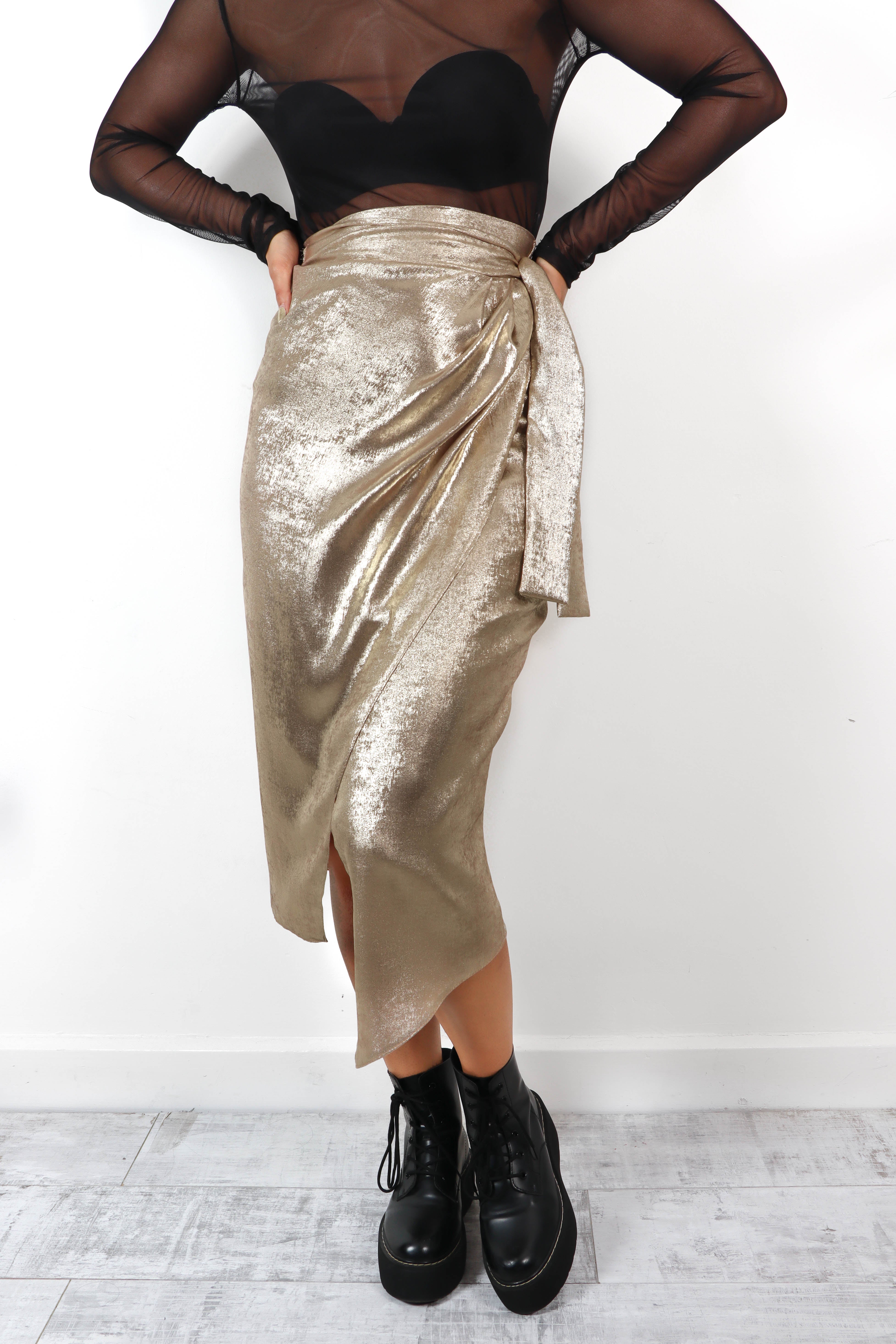 Wrap You Up - Gold Metallic Wrap Tie Midi Skirt