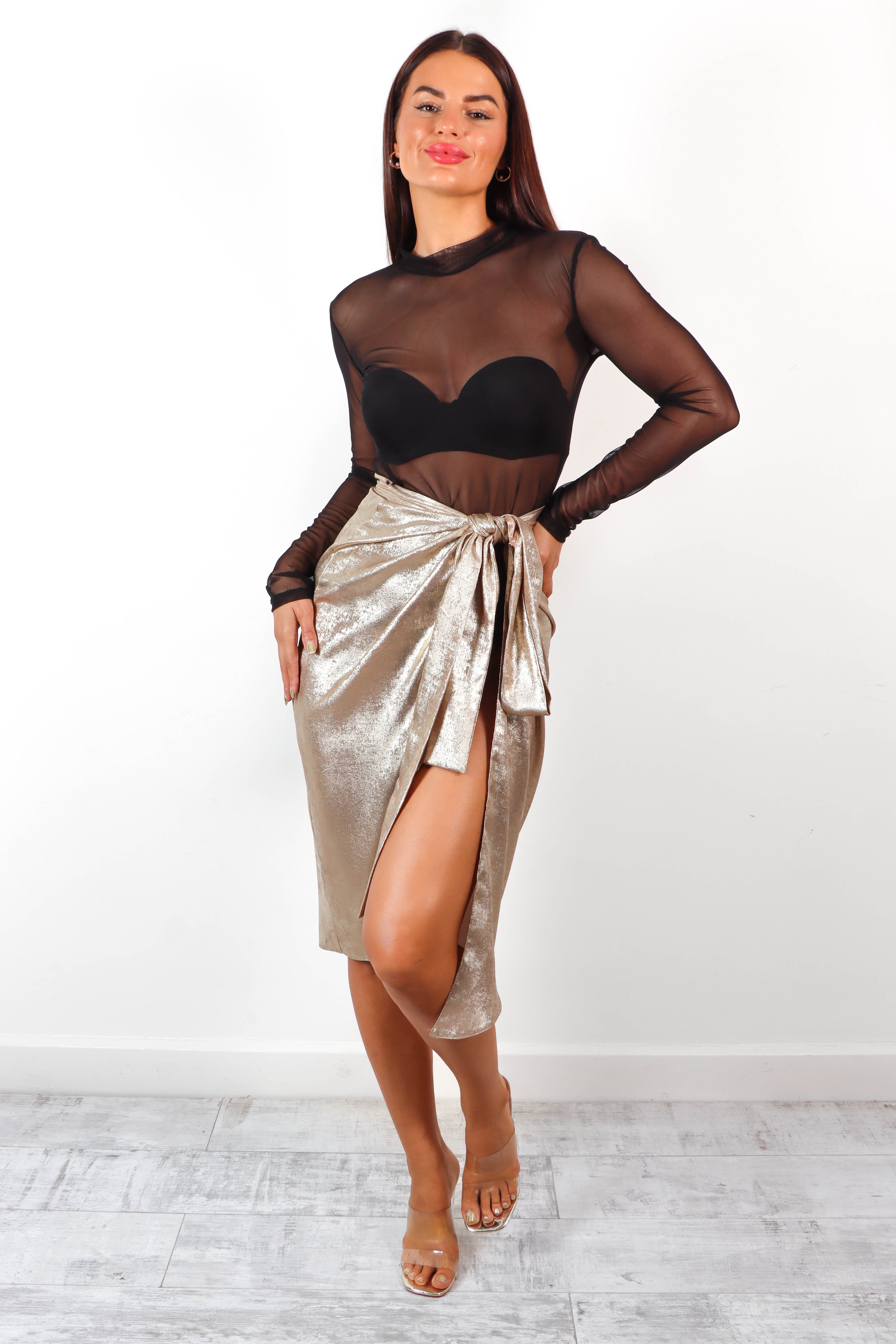 We're wrapping you up in this metallic gold wrap skirt, because you ARE the gift! This gold skirt comes in a midi length with a flattering high rise and a tie to fasten how you like, which creates a leg split to give those pins their moment in the spotlight. Pair with killer heels and a cropped graphic tee for an iconic going out look.