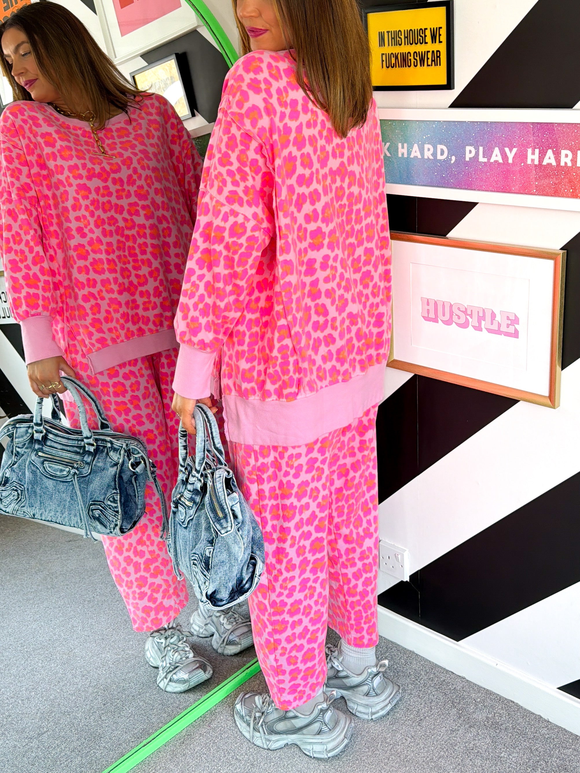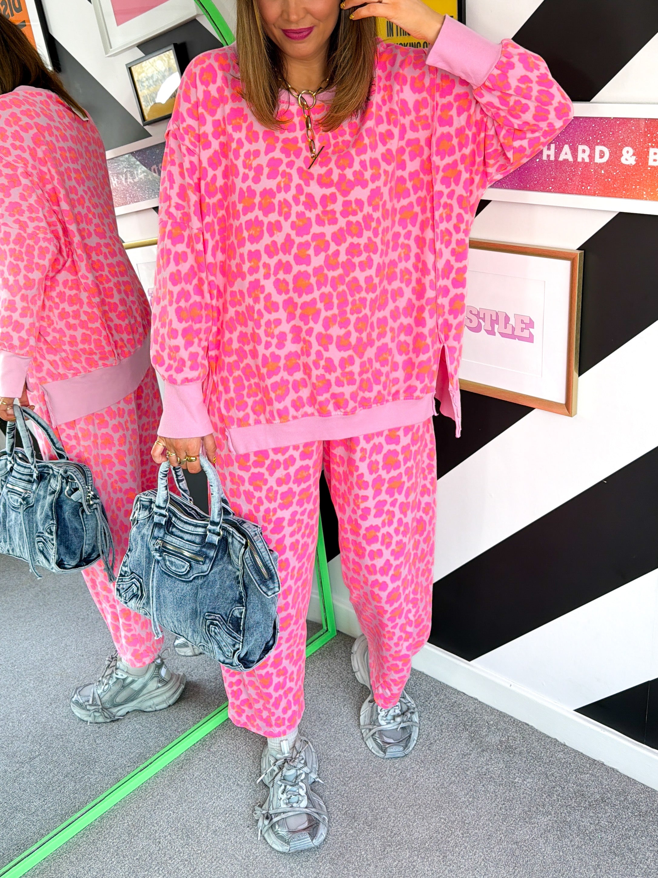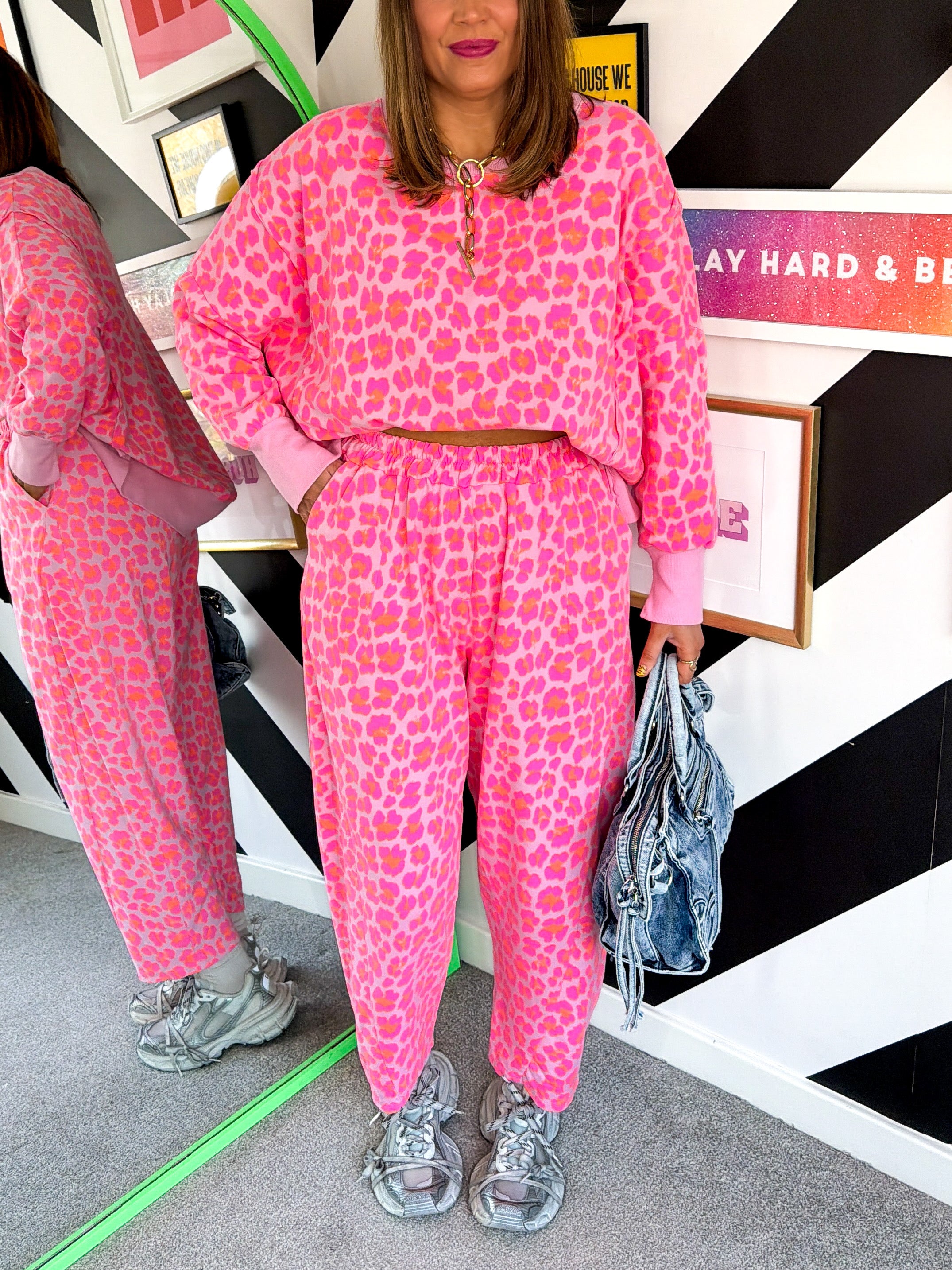 Make a statement with this bold neon leopard print co-ordinating set. The oversized square boxy long sleeve sweatshirt pairs perfectly with barrel leg jogging bottoms, creating an effortlessly cool silhouette. Crafted from lightweight fabric, the sweatshirt drapes beautifully while the bottoms feature an elasticated waist and practical side pockets for everyday comfort. The vibrant neon pink and orange leopard print ensures you'll stand out from the crowd—because classic leopard print deserves a modern, eye-catching twist. Perfect for those who aren't afraid to embrace bold colour.