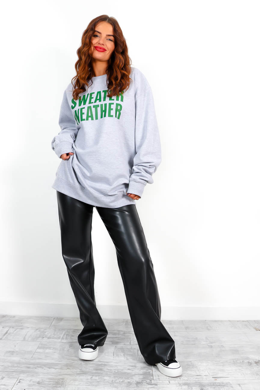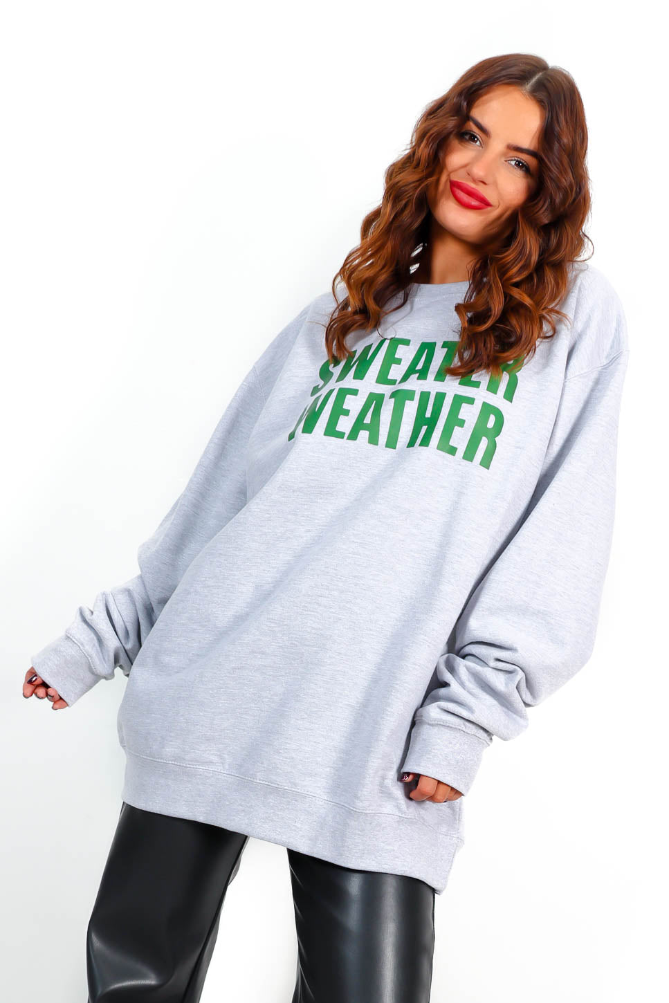 Sweater weather is better weather in our book, Doll! Wanna know how to make casual look cool? Don't sweat it! This grey slogan sweatshirt is the best way to stay comfy cosy this season without compromising on style. Featuring a slouchy crew neck fit with a forest green 'SWEATER WEATHER' graphic print centre stage. Whether you're heading out for lunch with the girls or binging a boxset at home, this sweatshirt is your new go-to for sure.
