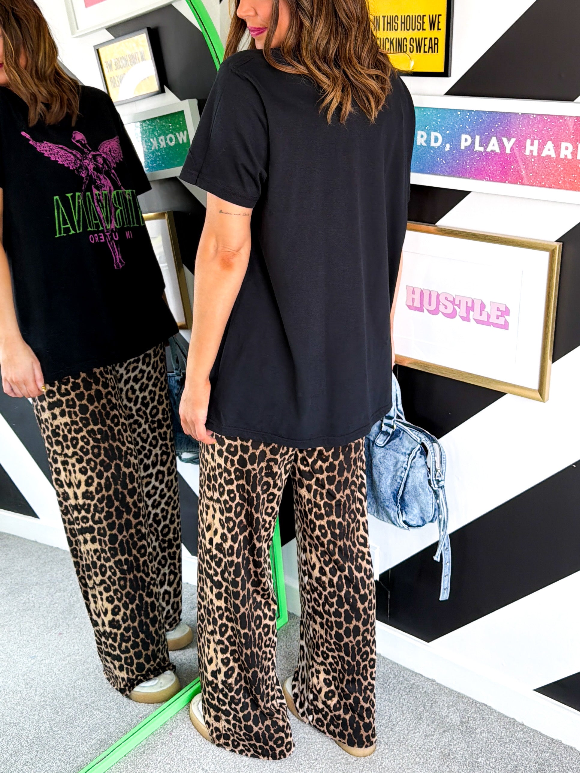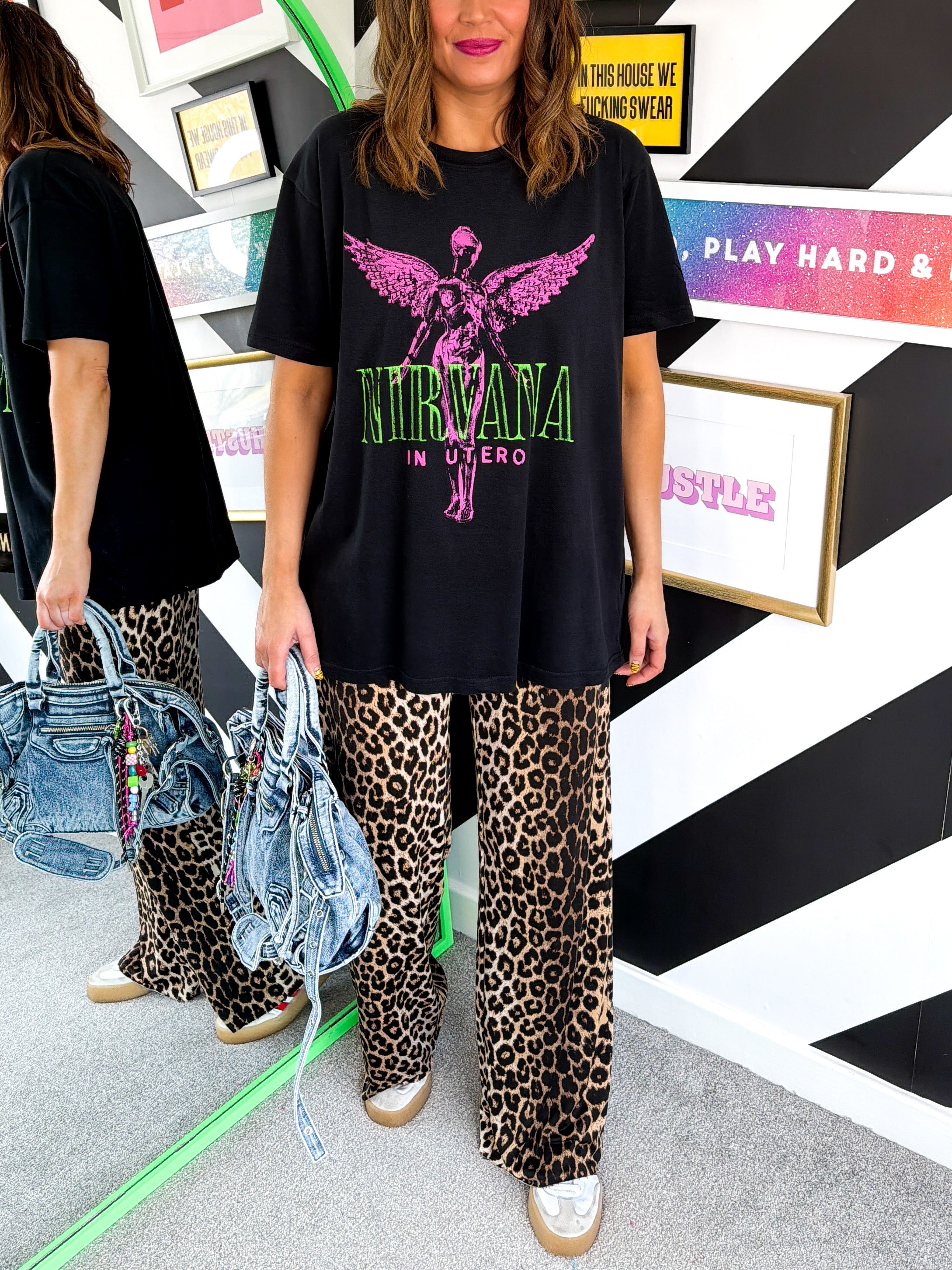 No need to get all dressed up, just come as you are! Smash off-duty chic in this grungy Nirvana graphic band t-shirt, featuring a classic crew neck tee fit in black with electric green & pink Nirvana band graphic. Style with our famous leopard print No Need To Change stretchy trousers for a cool and casual look. Air guitars at the ready...