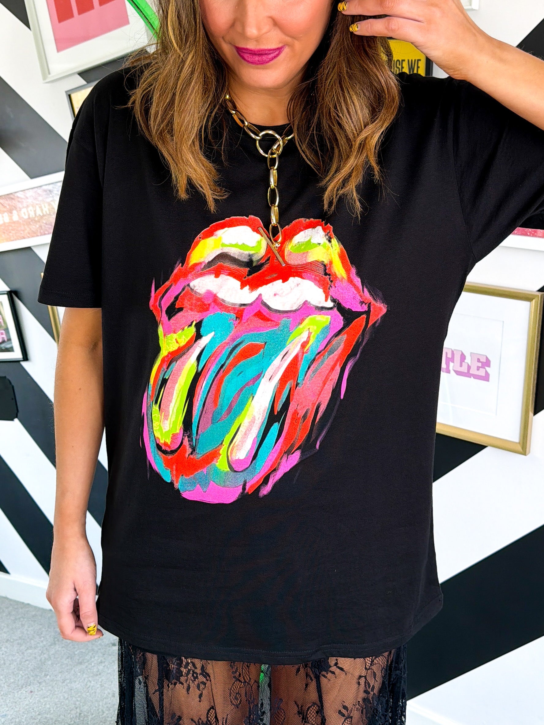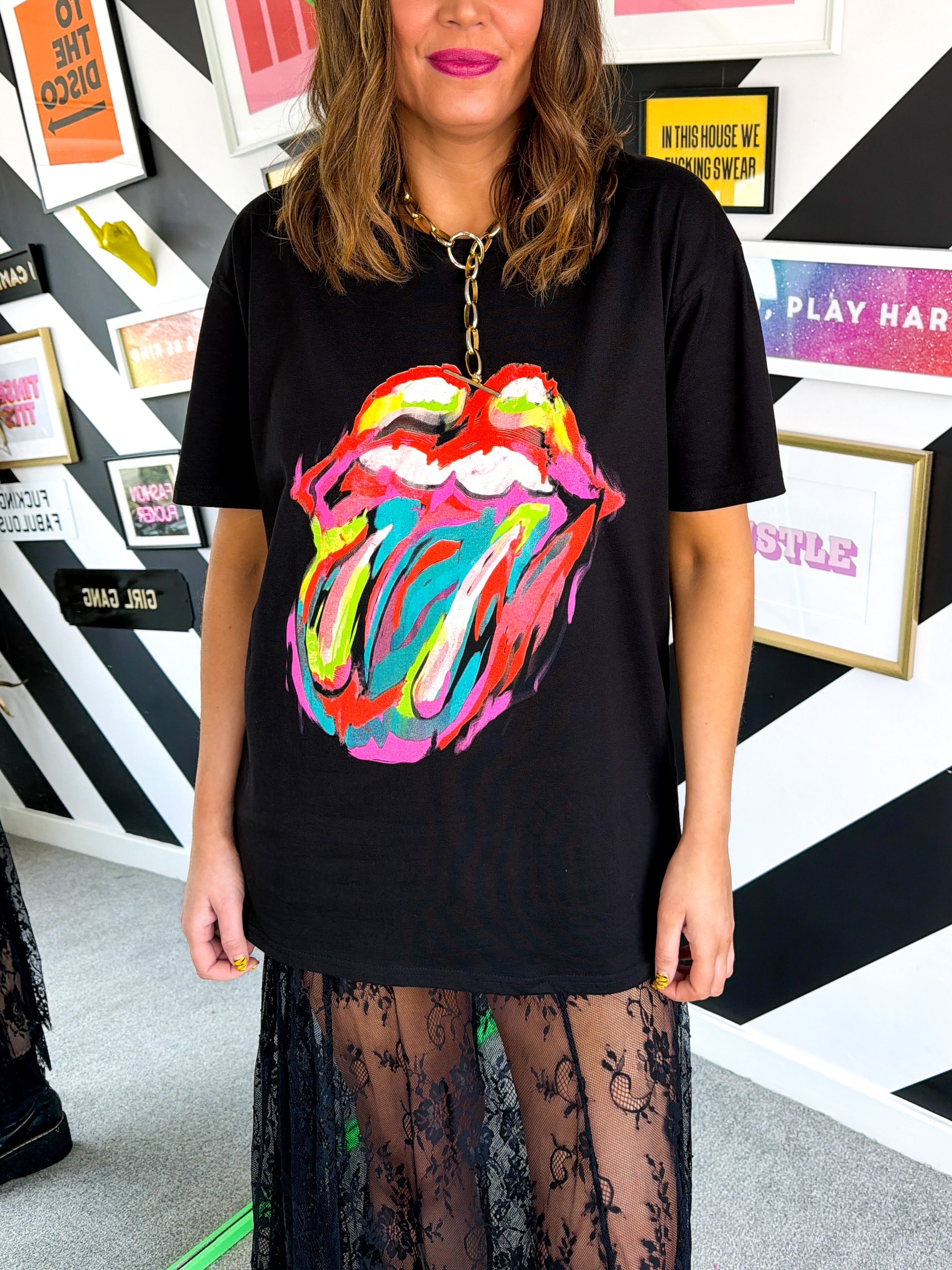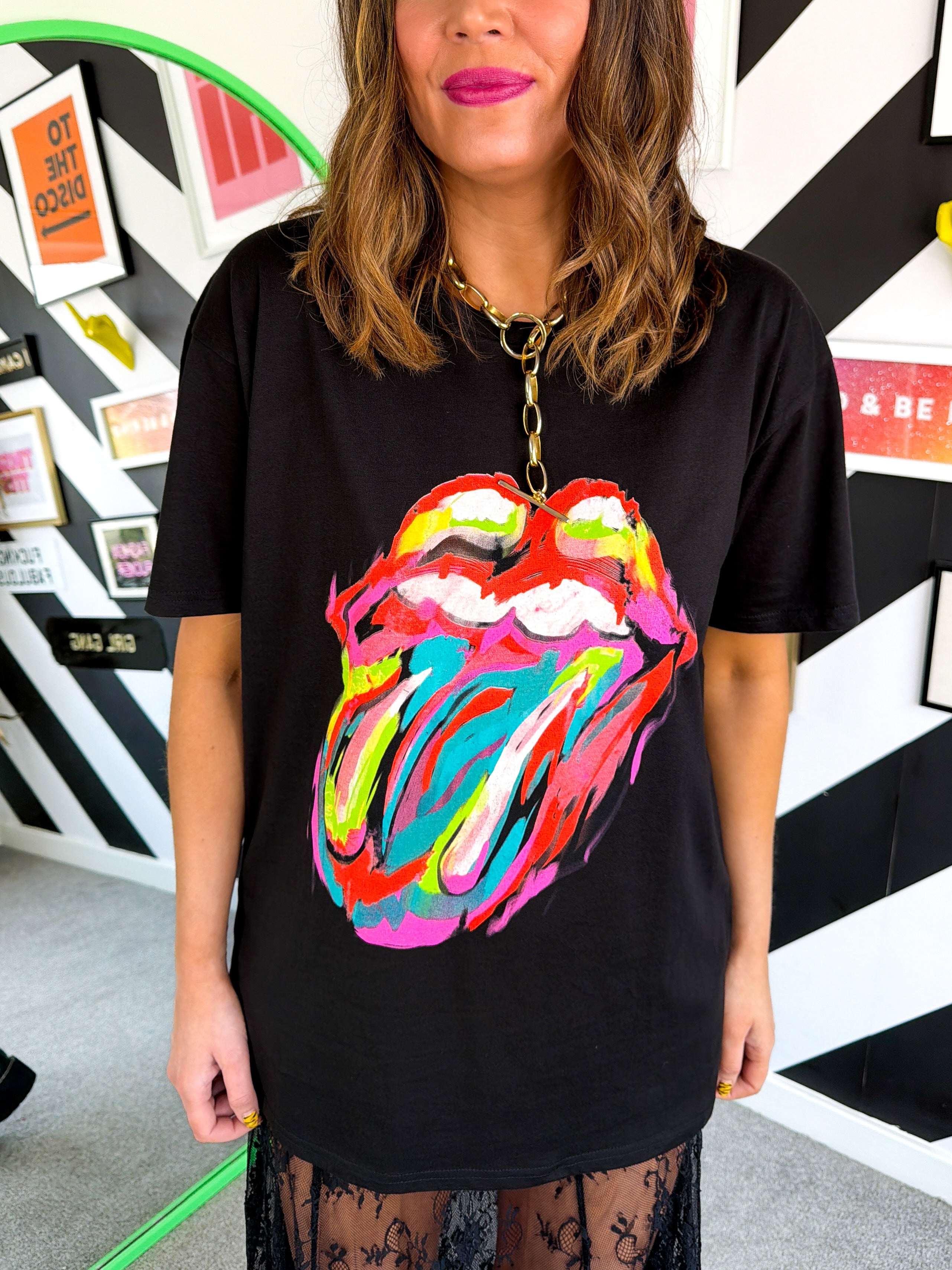 Black boxy fit t-shirt featuring the iconic Rolling Stones tongue logo with a fierce leopard print twist. This unisex essential brings rock 'n' roll attitude to your everyday rotation, whether you're heading to work or hitting the festival circuit. Bold, unapologetic, and ready to turn heads—because sometimes you just can't get satisfaction from ordinary basics. Let it bleed into your wardrobe and show the world you've got that wild, rebellious edge.