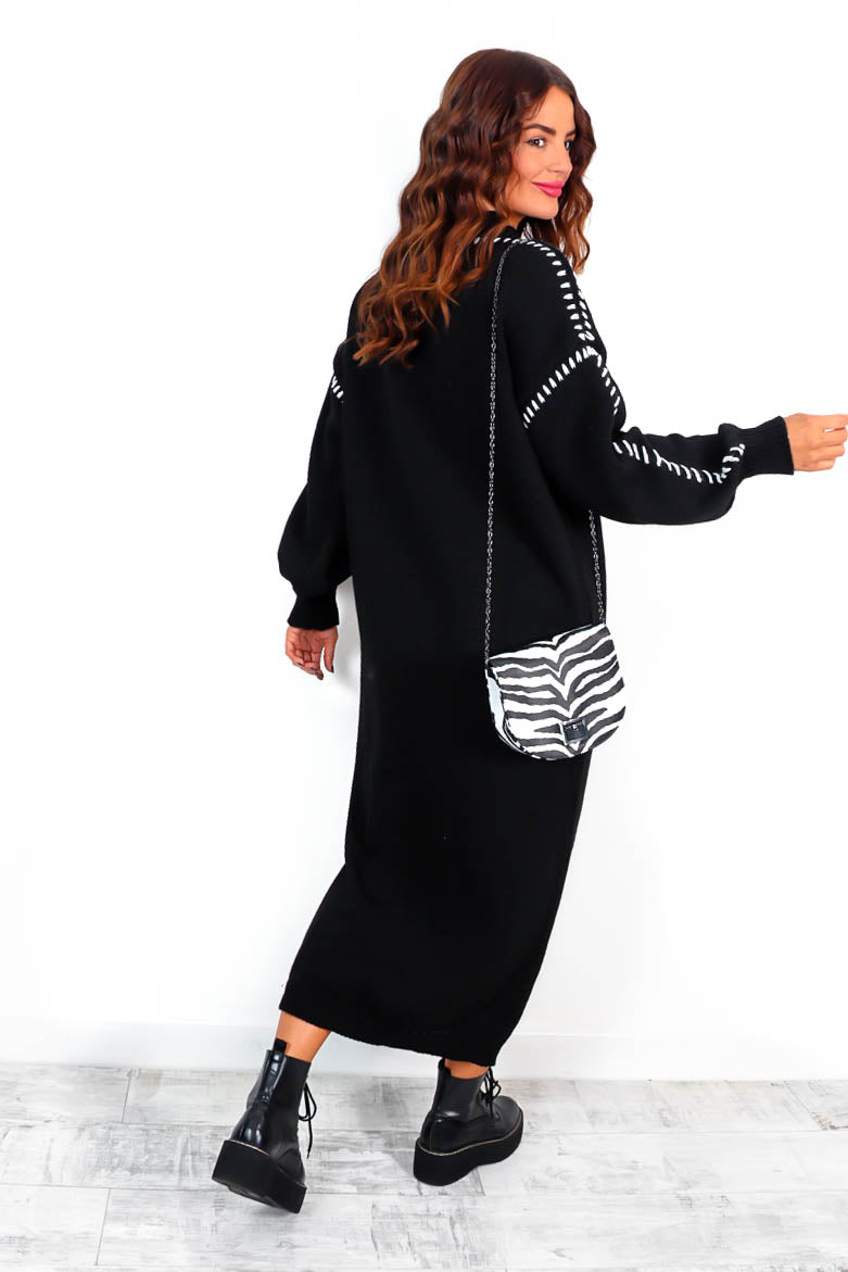 You gotta be in knit to win knit! Whatever your plans are this season, this knit jumper dress is a definite wardrobe must-have, Doll. With trendy white contrast stitching, this black knitted dress features a rounded neckline, drop shoulders and a cosy oversized fit. Every moment is a monochrome fashion moment in this stylish piece of knitwear, so... don't know about you, but we'll be wearing this LBD until further notice. Throw on with chunky boots and an oversized leather jacket for a cosy glam day drinks look.