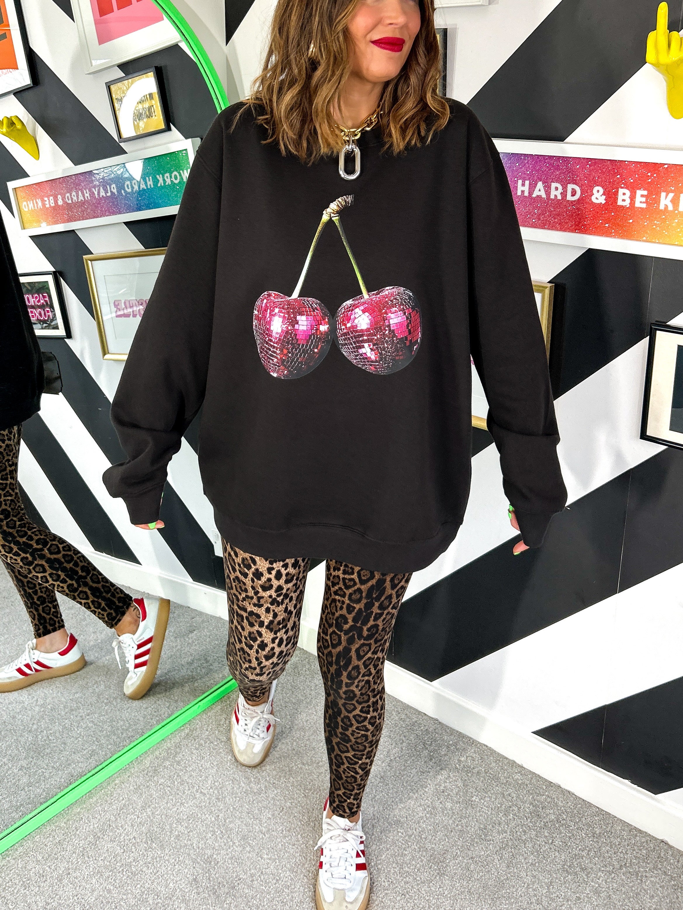 Add a splash of fun to your outfit with this oversized black sweatshirt featuring a shiny disco ball cherry print front and centre. Its thick, heavy fabric and boxy square fit make it a cool, playful choice for casual days when you want to stand out. Embrace your fruity side this season!