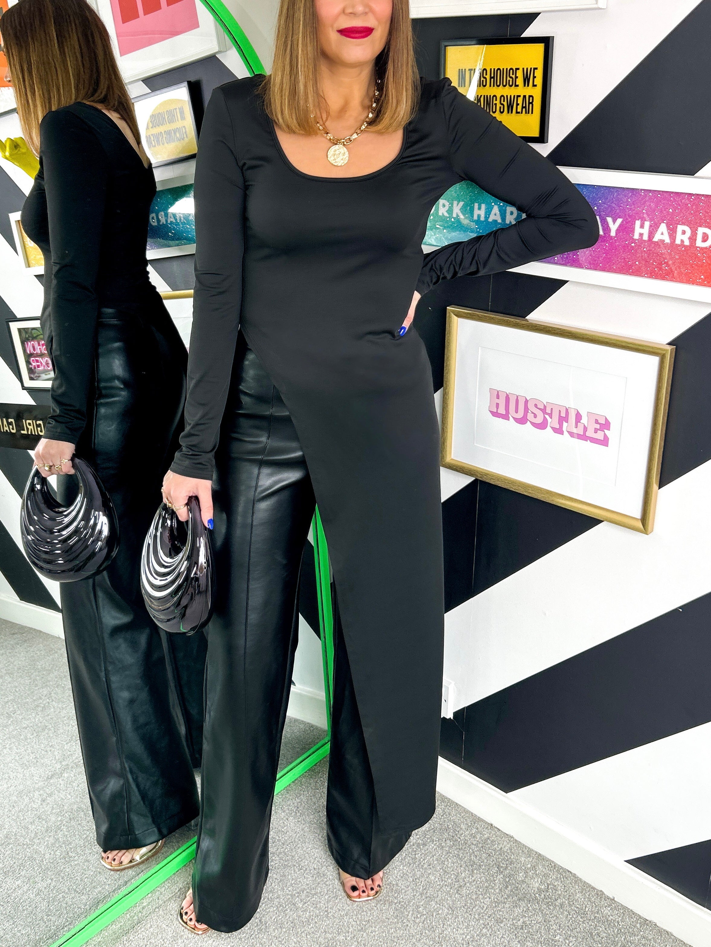 Elevate your style with the Back Asymmetric Long Sleeve Top, crafted from sleek black stretch jersey. Its unique asymmetric cut and round neck create the illusion of a chic dress layered over trousers—perfect for mixing glam with comfort. Pair it with faux leather trousers for an evening out or style it down with track bottoms for a cool, effortless day look. This top effortlessly blends edgy sophistication with laid-back vibes, making it your new wardrobe must-have.