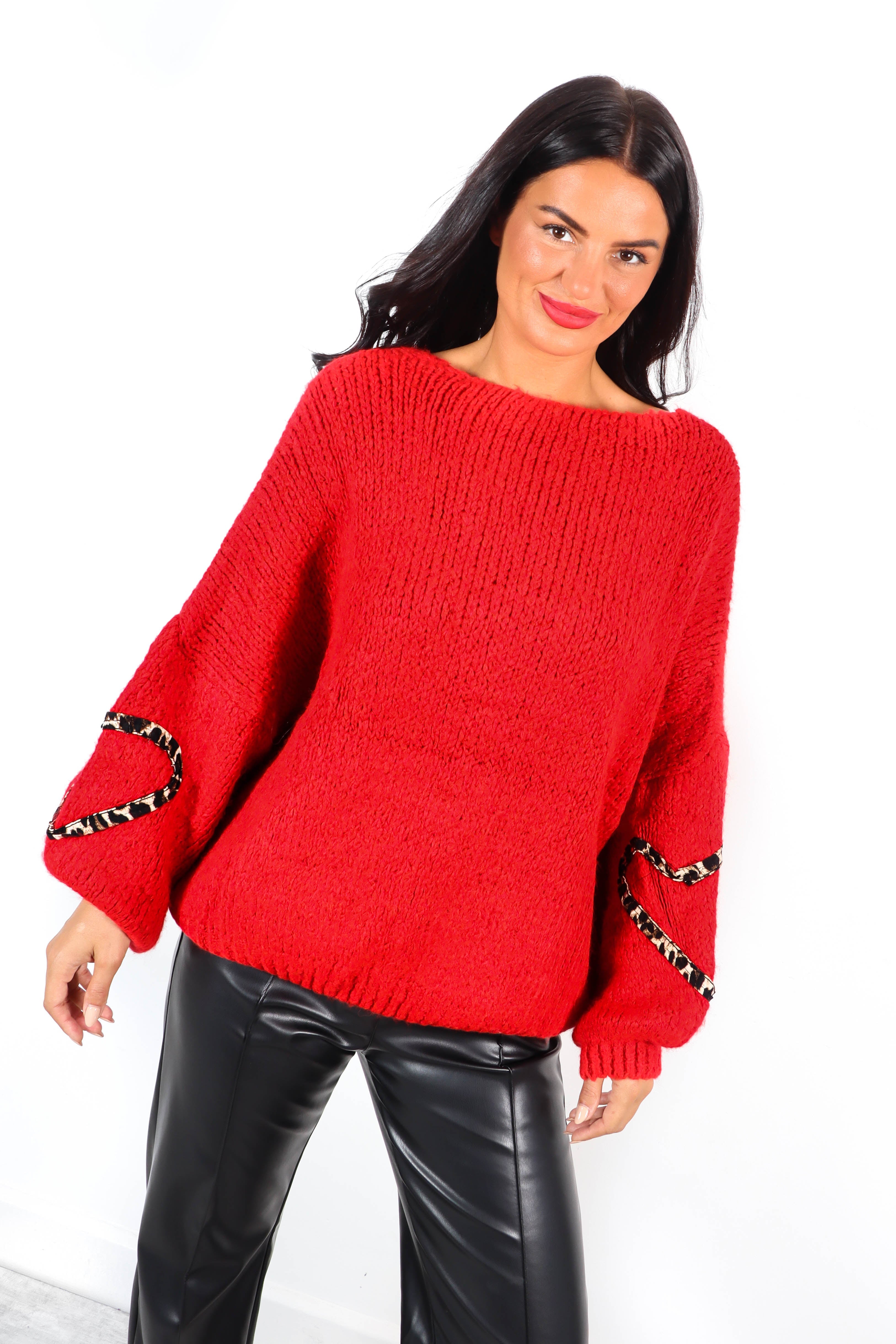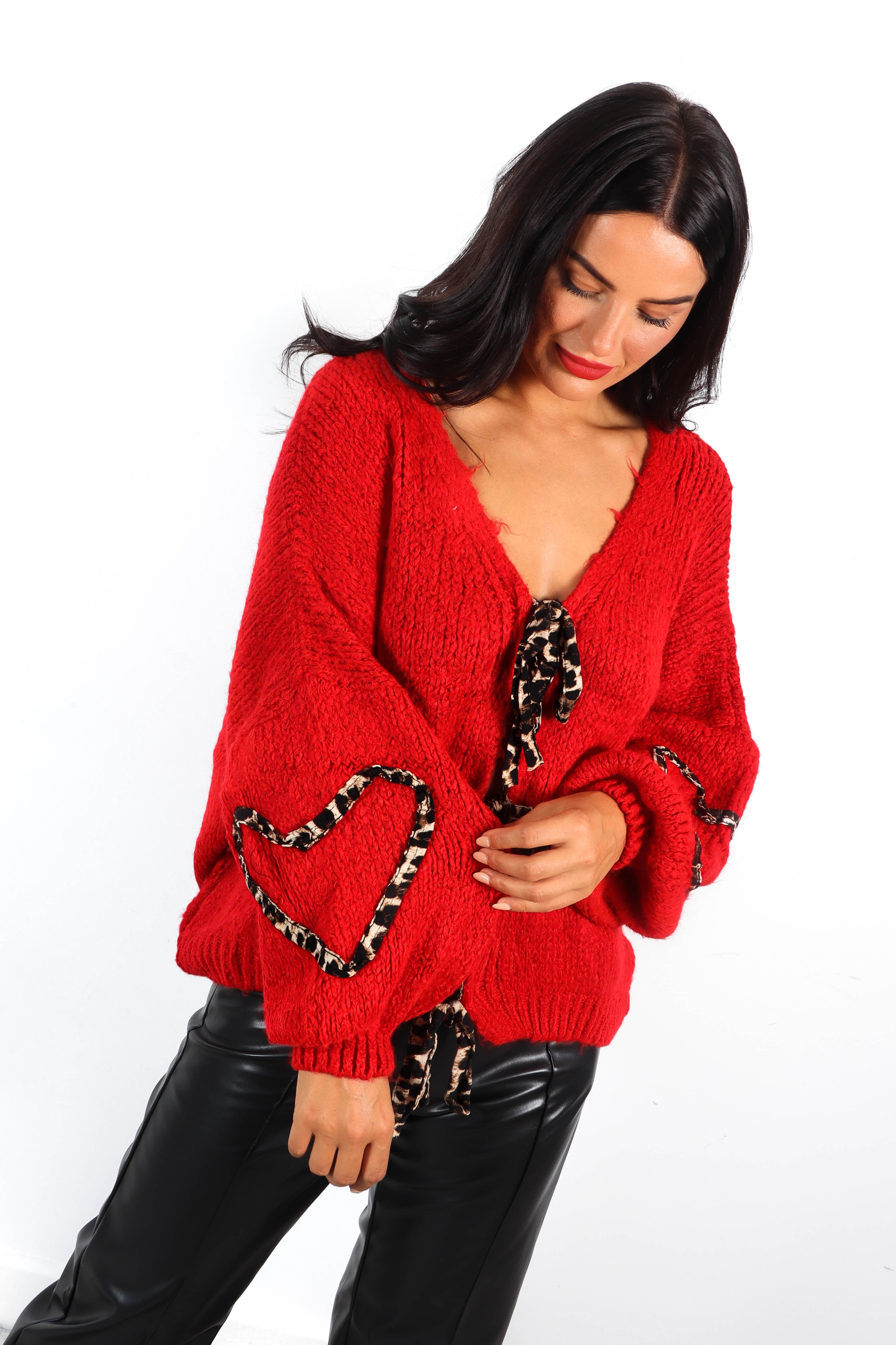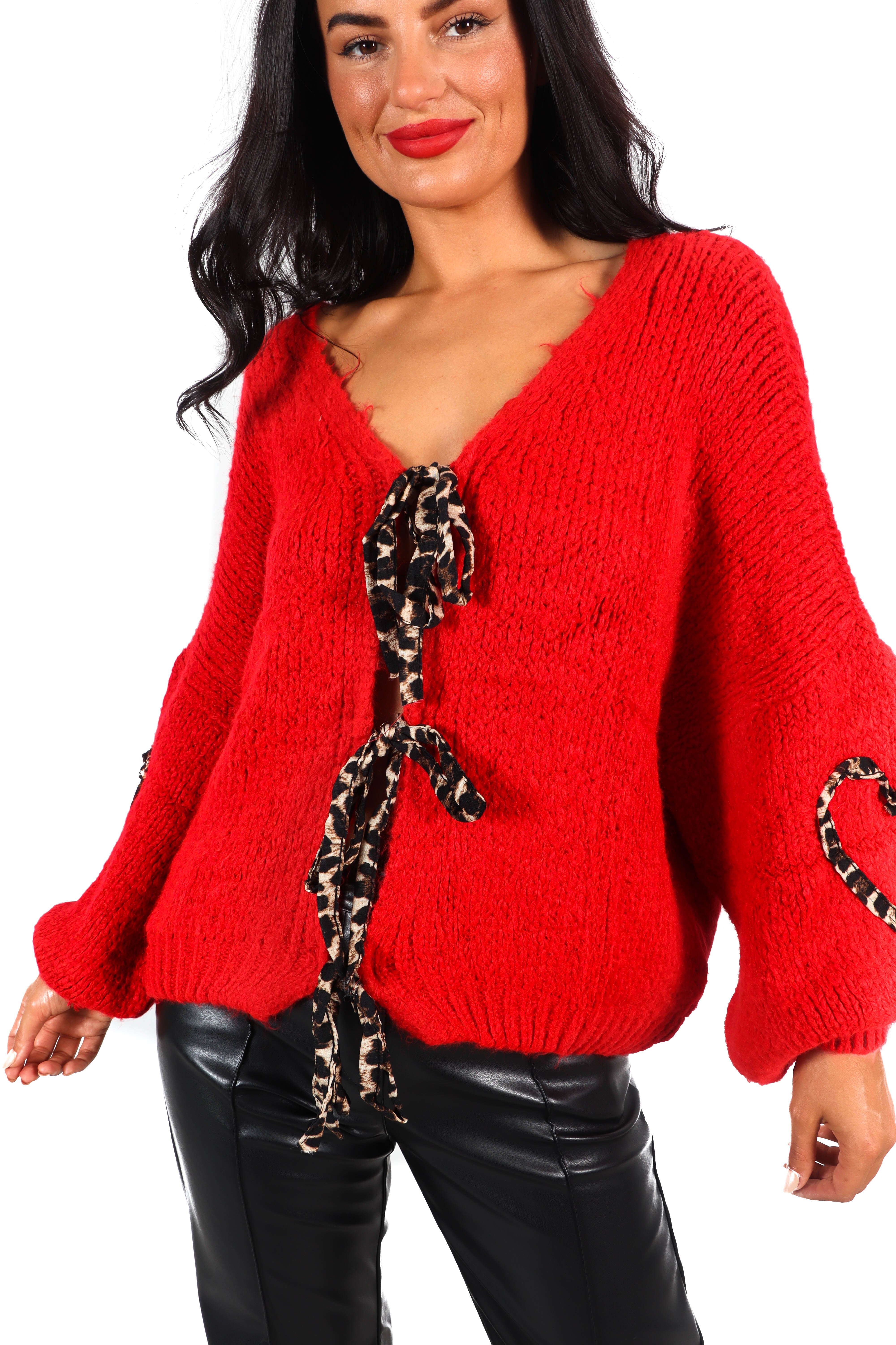 Bow-n to be wilddddd 🐆. Get ready to pounce on this red knit tie front jumper, an animal print must-have to look fierce and fabulous this season. With leopard print ties and heart details, this tie front jumper can be worn fastened at the front, back or open as a cardigan! Pair with high-waist faux leather shorts and over-the-knee boots for weekend shenanigans.