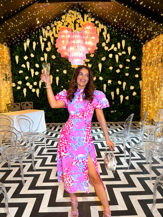 For those times you wana make an entrance, it's got to be this show stopping animal print midi dress. Roaring in an all over pink and lilac leopard print, this beauty has a waist tie that can be tied multiple ways and is complete with dramatic puffed sleeves, a cheeky leg split and a high neckline. Prepare for those compliments to pour in like prosecco as you strut into the room shimmering in glowing gold accessories.