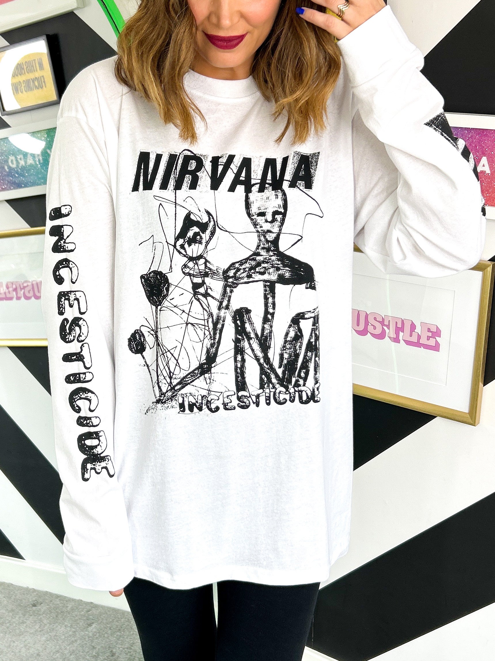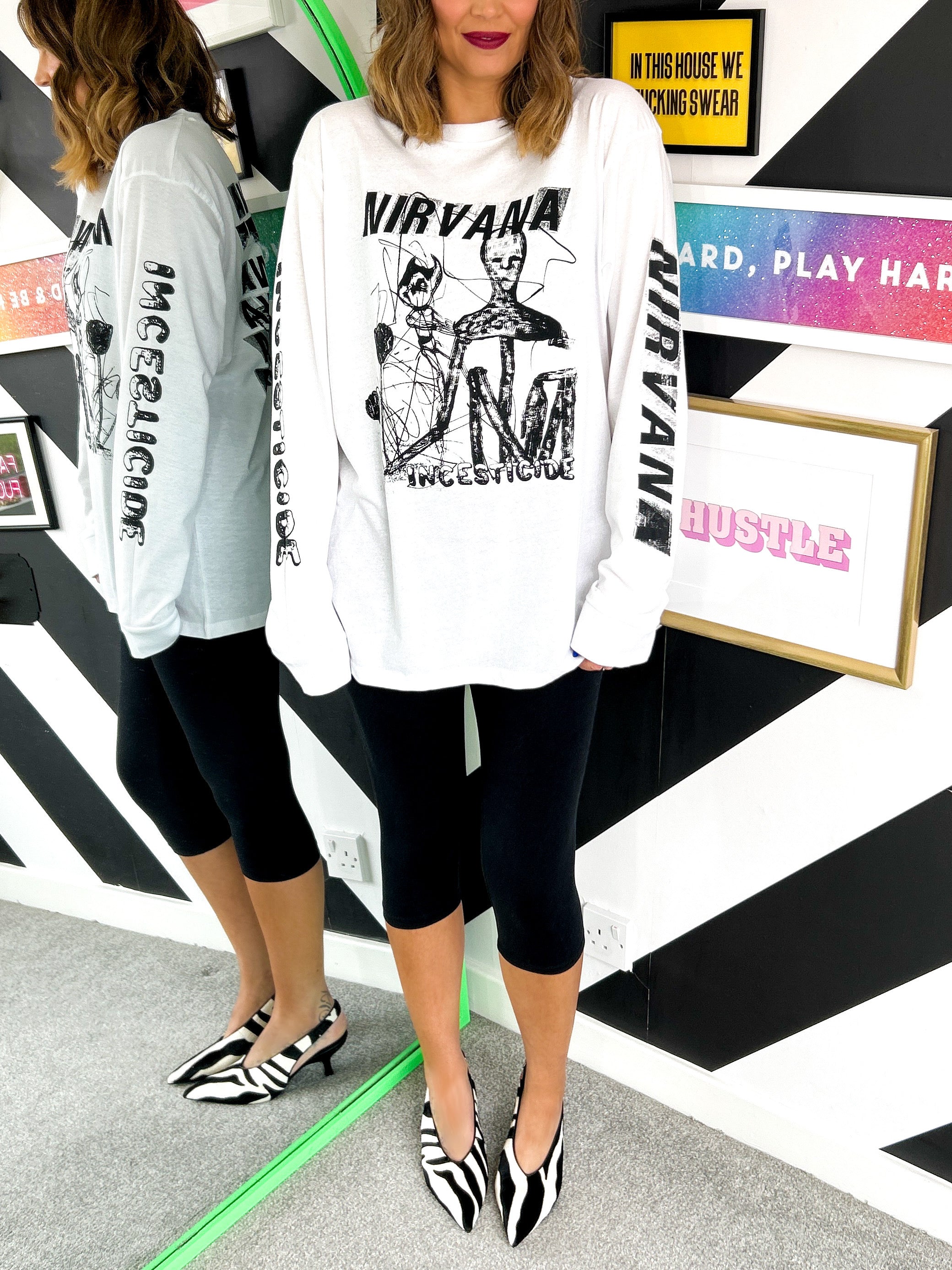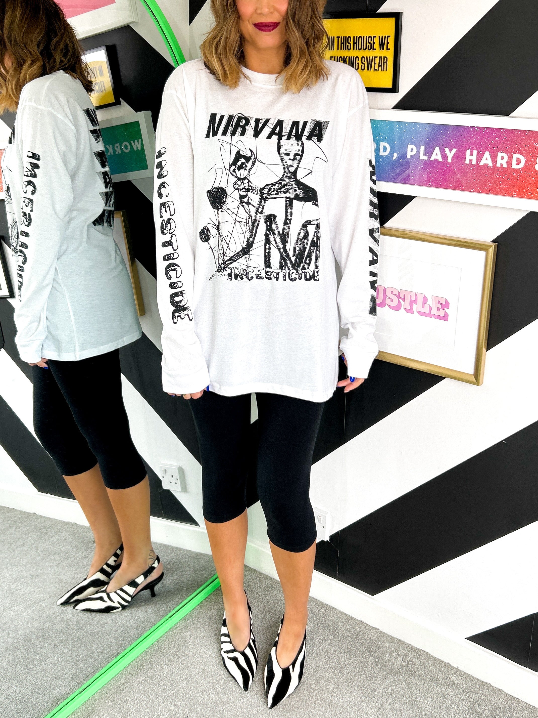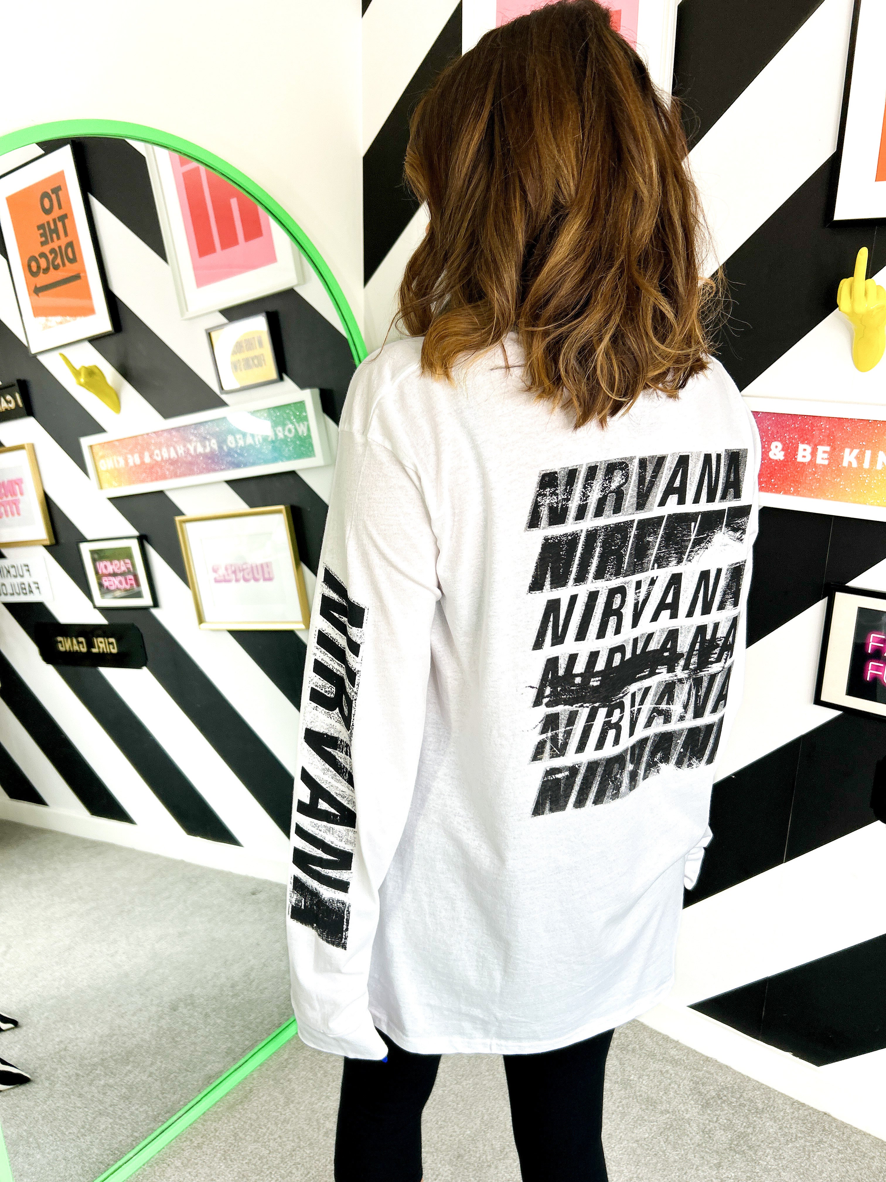 Ready to rock non-stop? This white long-sleeve tee bursts with attitude, featuring bold Nirvana graphics across the front, back, and sleeves. Its classic crew neck fit keeps things comfy while letting your playful, music-loving side shine. Team it with your favourite leopard print mini skirt and chunky boots for a festival-ready look that’s sure to steal the spotlight.