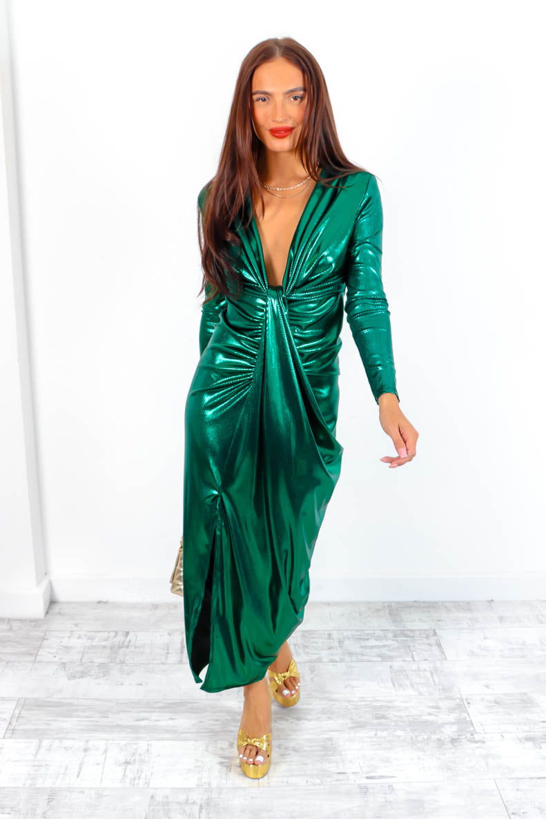 Shes Frisky - Forest Metallic Plunge Midi Dress