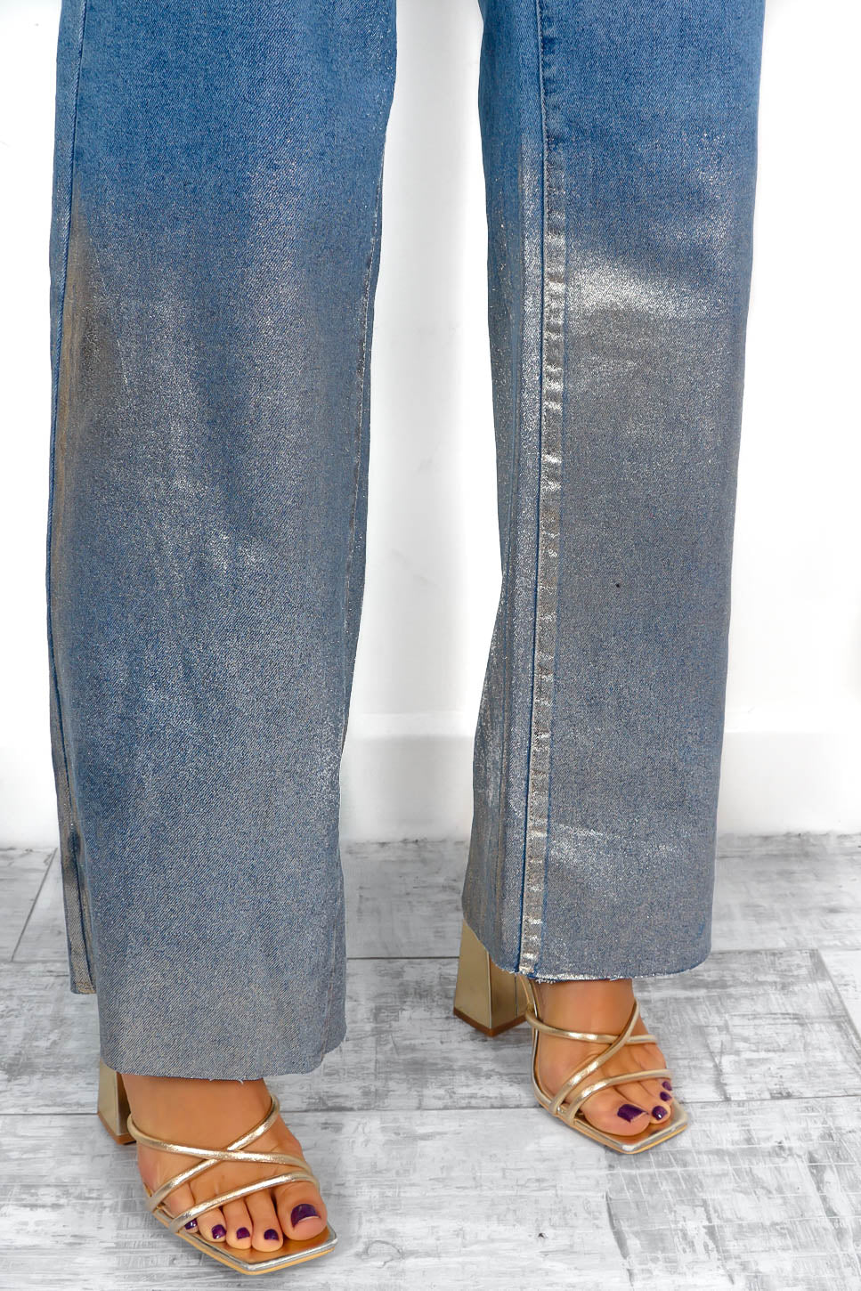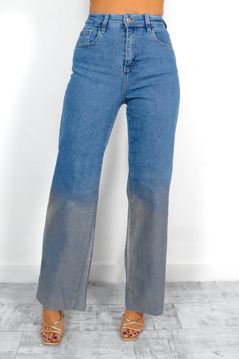 Stood You Up - Blue Gold Metallic Hem Wide-Leg Jeans